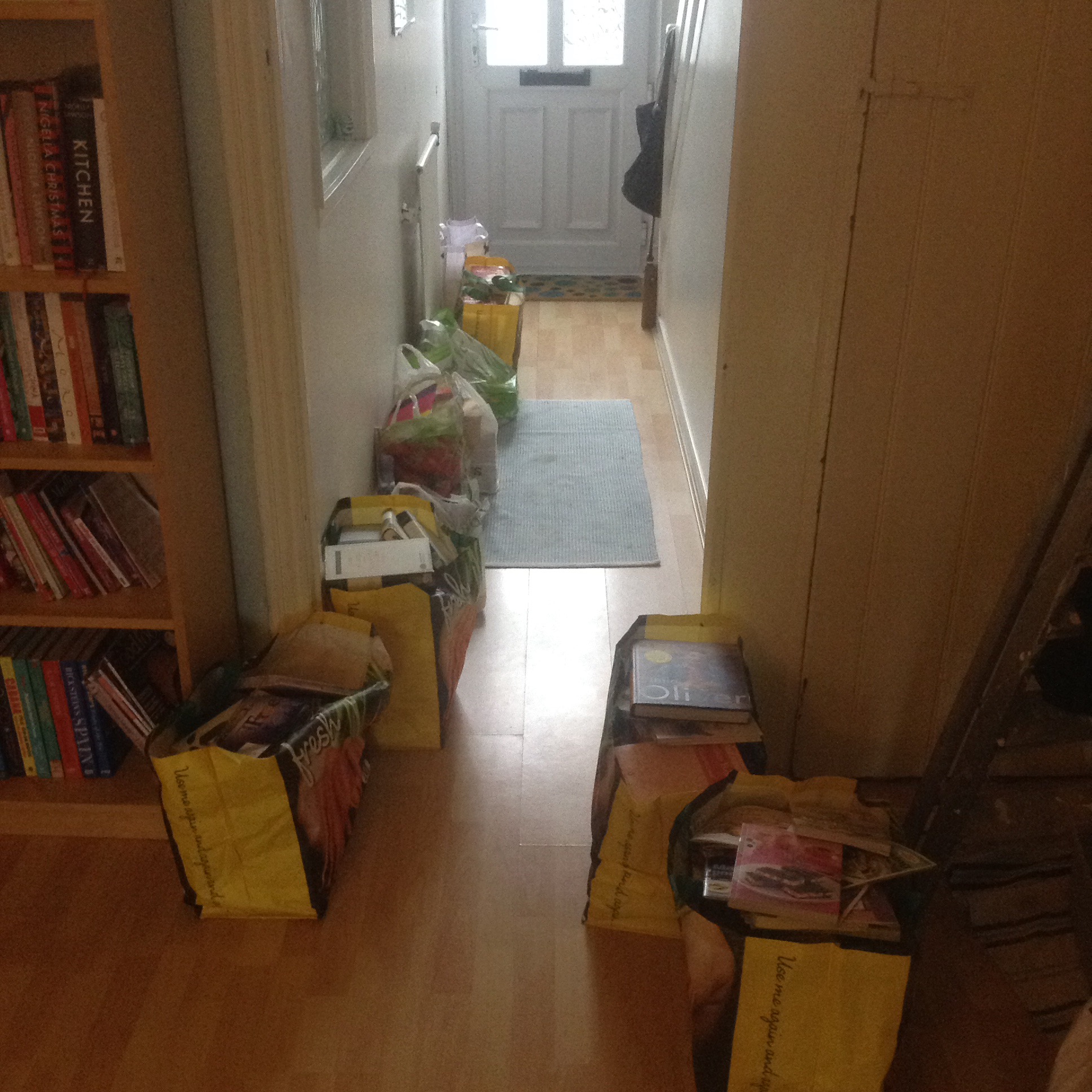 Every room in the house has at least one bookcase in it, and with my Christmas haul they were groaning under the weight. Books were stacked haphazardly and blocked the view of other titles, and my carefully organised system was out of the window. A culling had to happen, and the bags in the picture show my progress so far.